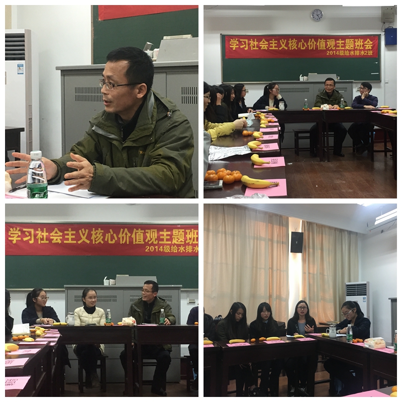 今天是2016年12月1日,在2016年的尾声,14级给排水2班,于工程馆108教室召开了“学习社会主义核心价值观”主题班会暨团日活动。出席本次活动的嘉宾有:欧洲杯赛程 党委书记笪学军老师,14级环境院辅导员曾莉老师。