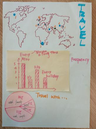 今天上午,各位同学按照昨天的分组,将昨天下午对亚伯海滩游人的调查进行数据整理和统计,并且运用各种图表将结果可视化。同学们通过头脑风暴,辅以俏皮的图案,将展板做的生动有趣。通过这次活动,同学们不光对英国人的生活有了更深入的了解,同时通过对话更进一步的锻炼了同学们的口语。