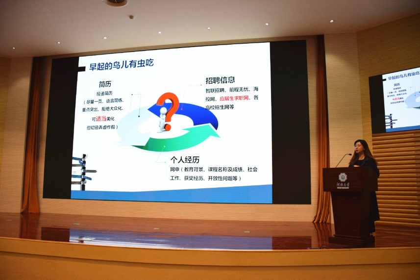 目前各大企业的招聘会正紧锣密鼓地进行,作为2020届毕业生的我们也即将面临就业的选择。考研、出国、找工作或是考公考事,学院里就这四个大体方向建立了四个群,供有意向的同学加群探讨交流,并且后期会有专门的管理员在群里发布相关消息。根据目前统计的情况来看,考研是同学们的主要选择,但考研成功的人数和失败人数总体来说是一半对一半。金老师建议大家考研的同时“两条腿走路”,即考研的同时也找工作,在明年十月中旬之前手里拿到一个offer。金老师与大家倾情分享了她的求职之旅,以自身的经历为大家提出了求职与考研两手准备的策略。同时,金老师强调了个人简历的重要性,并与大家分享了简历制作的技巧以及与面试招聘相关的一系列干货。