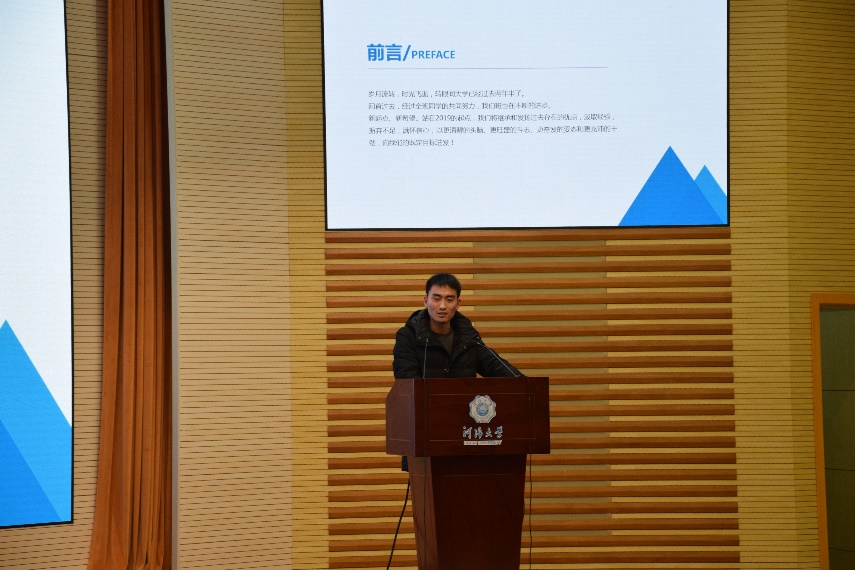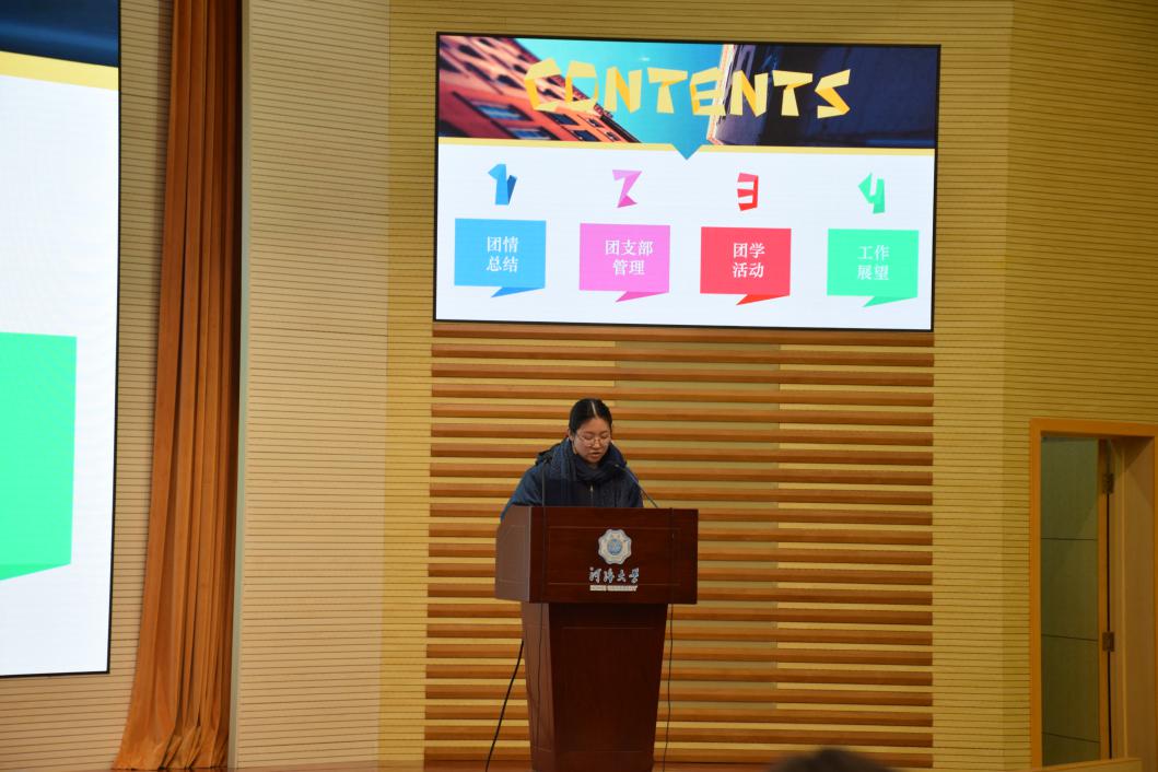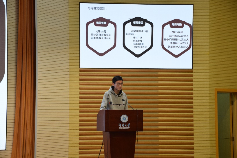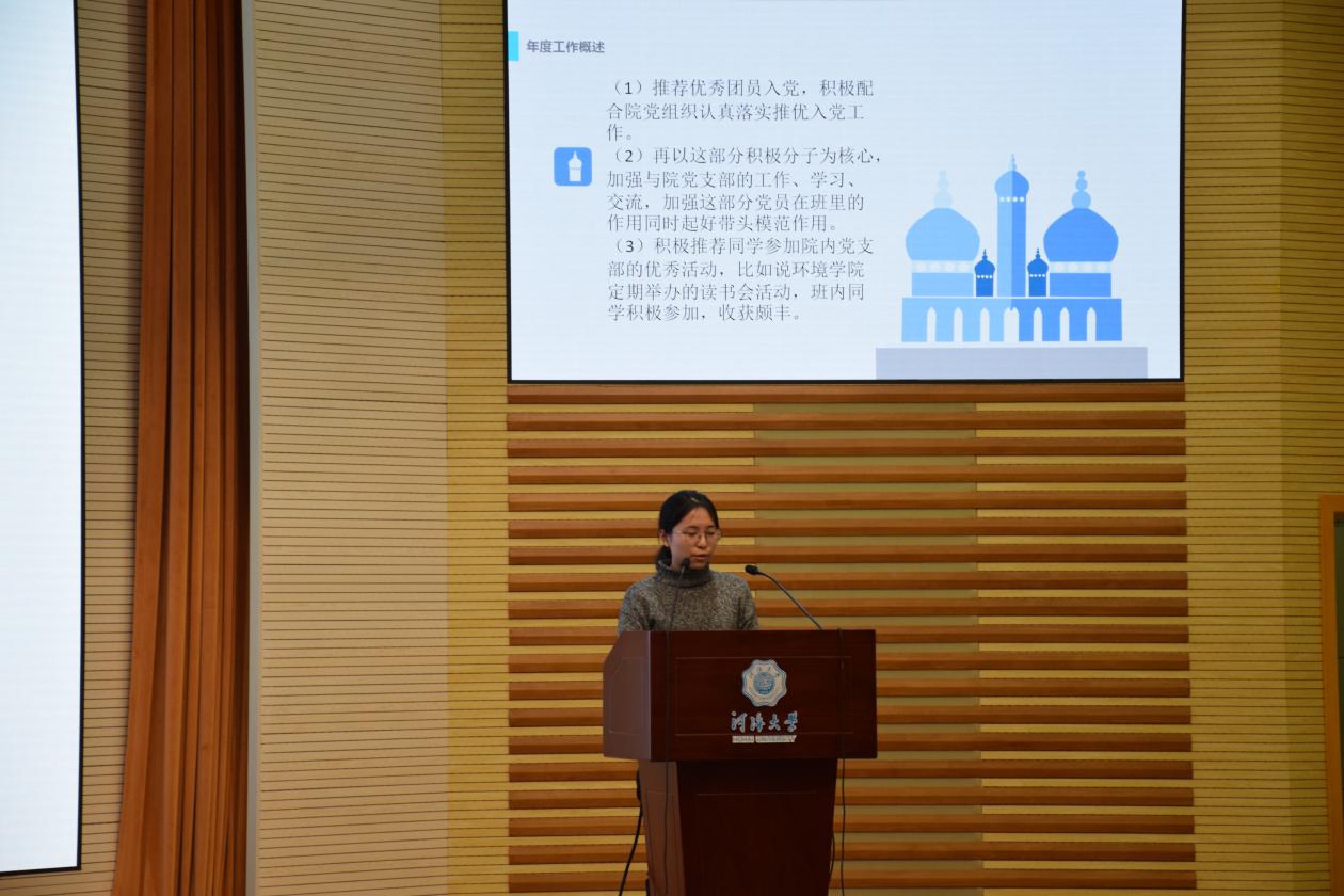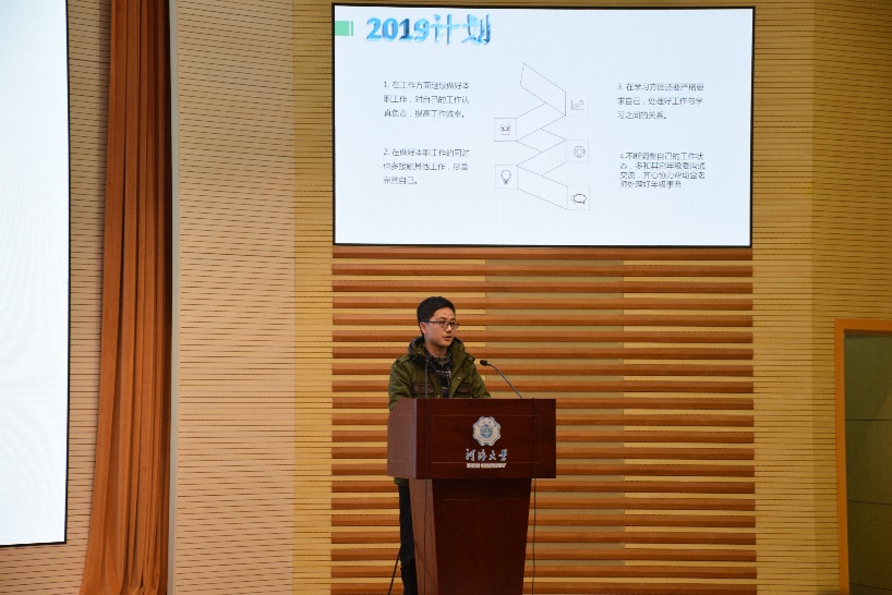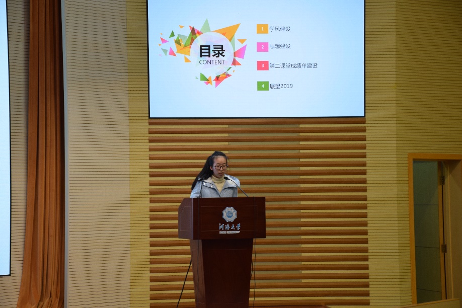 第二项内容是学生干部汇报。首先是党支部进行述职报告,接下来是各年级委员从年度工作总结、问题改进、2019计划等方面进行汇报,最后是各班班长从思想建设、学风建设、文化建设、PU第二课堂成绩单建设等方面对本班情况进行概括总结,并提出了2019年的相关计划。