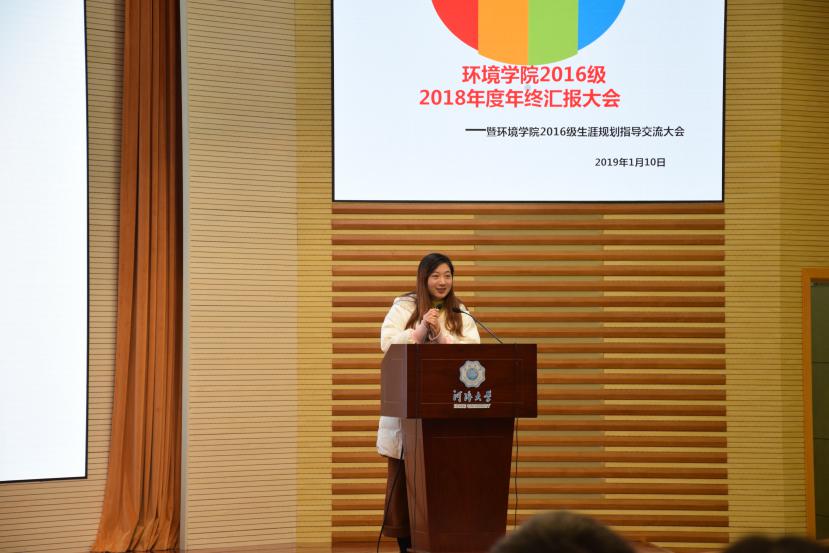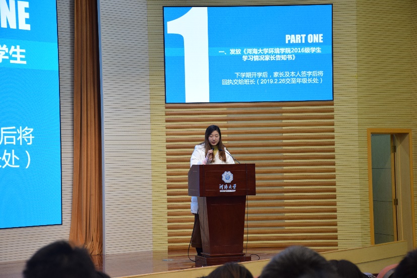 此次年级大会首先播放了一段主题为欧洲杯赛程 2016级本科生2018年度报告的视频,从学风建设、文体活动、精神建设等各方面进行总结。之后由辅导员金意倩老师进一步总结概括2018年各项事宜。
