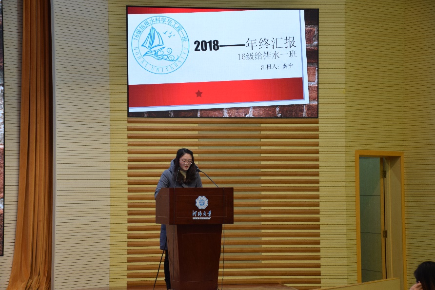 (左图为环工一班班长唐瑜同学进行汇报,右图为给排水一班班长薛宁同学正进行汇报)