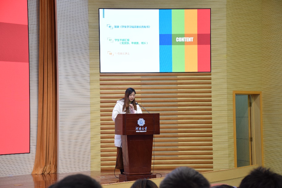 (图为辅导员金意倩老师在主持年级大会)
