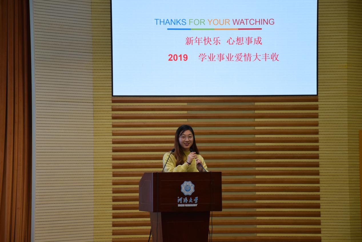 第三项是年级事务通告,辅导员金意倩老师进行了详细的汇报,主要是关于诚信应考、寒假时间、寒假实践、网课问题、避免校园贷等方面,金老师着重强调了关于避免校园贷的事情,并希望全体同学能够在寒假期间思考自己以后要做什么,提前做准备。