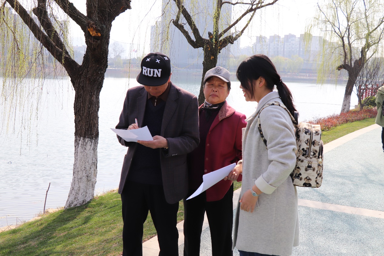 上午参与世界水日活动的50位志愿者在图书馆前集合,在负责人的带领下前往花神湖。各个小组的组长向组员们传达注意事项,然后将调查问卷分发下去。在短暂的沟通后,志愿者们分散开来,分头进行任务。