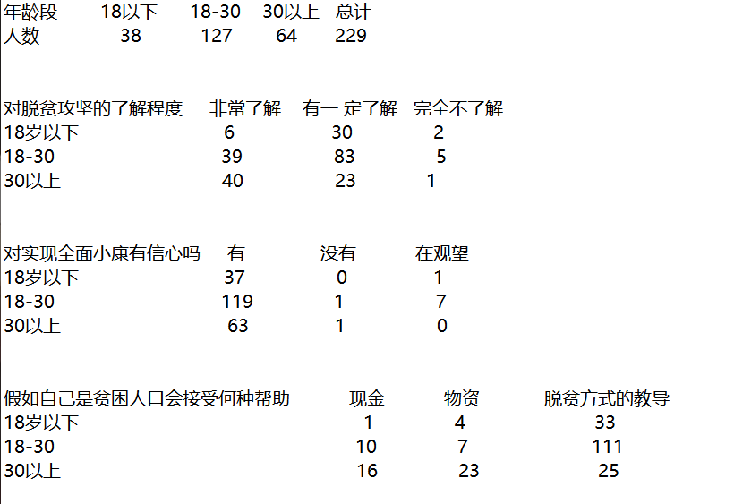 数据中可以明显看出不同年龄段对于脱贫攻坚战的了解和认知是有一定不同的,而不同地区的扶贫方式也有各自的侧重点,疫情的影响导致了部分地区经济状况的波动。