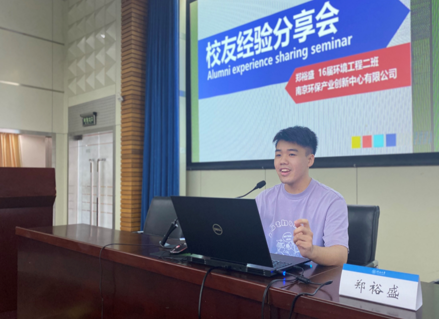接着做经验分享的是在今年毕业并就业的16级环工专业郑裕盛,现工作于南京环保产业创新中心。他首先介绍了南京环保产业创新中心的概况和核心技术。接着,从就业方向,兴趣爱好和爱好与就业的关系三方面介绍了他的学习工作经验。郑裕盛还以自己学习PS和摄影为例,鼓励同学们勇于迈出第一步,在大一提升能力,加入学生组织锻炼自己。最后,建议同学们平衡自己的专业与兴趣,在就业时理性权衡。