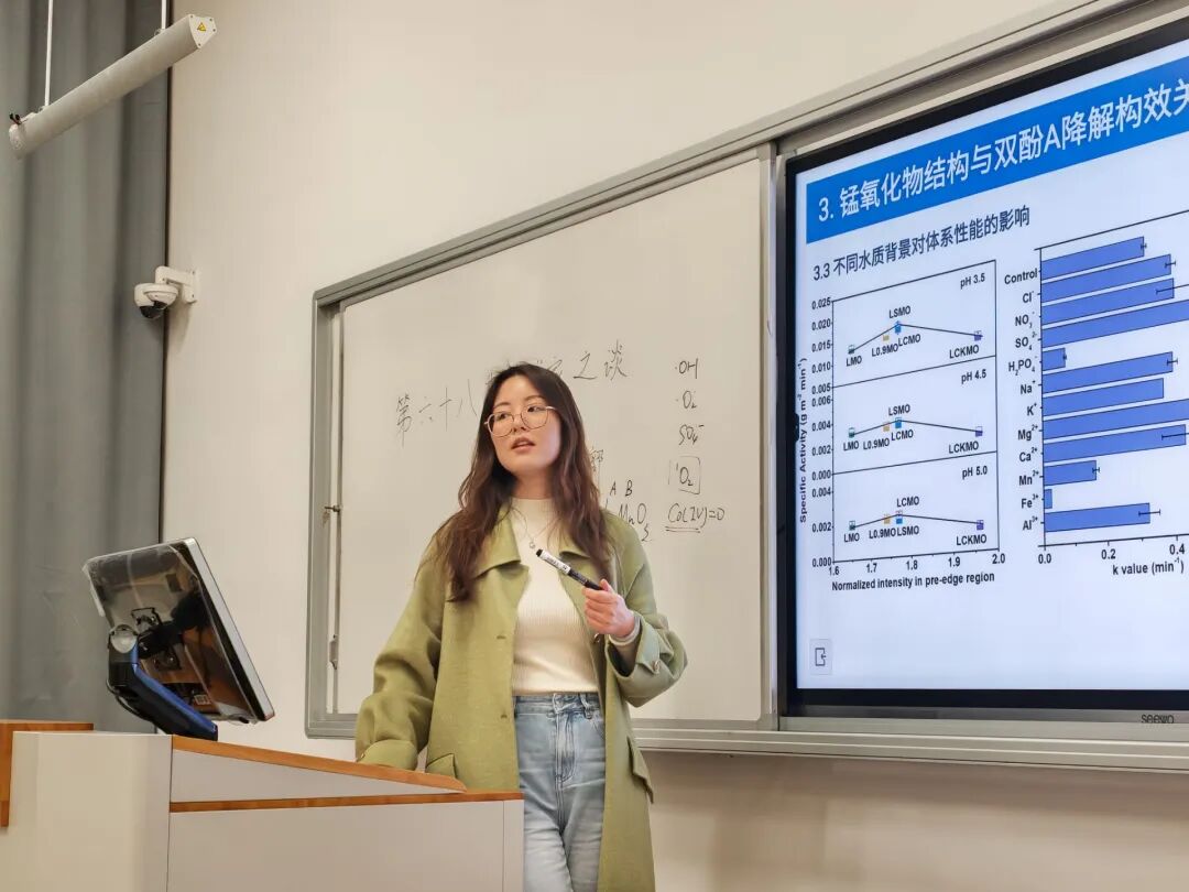 首先,蒋一兰老师从研究背景及其意义引入,指出运用氧化物结构调控降解新污染物的解决思路:通过结构设计,优化直接与间接氧化路径,实现新污染物的靶向降解。然后运用两个具体的实例,分别从间接路径与直接路径两个方面进行了细致地讲解。同时,针对学生提出的问题,蒋老师也进行了细致耐心的解答,鼓励同学们不要害怕未来,大胆去尝试。